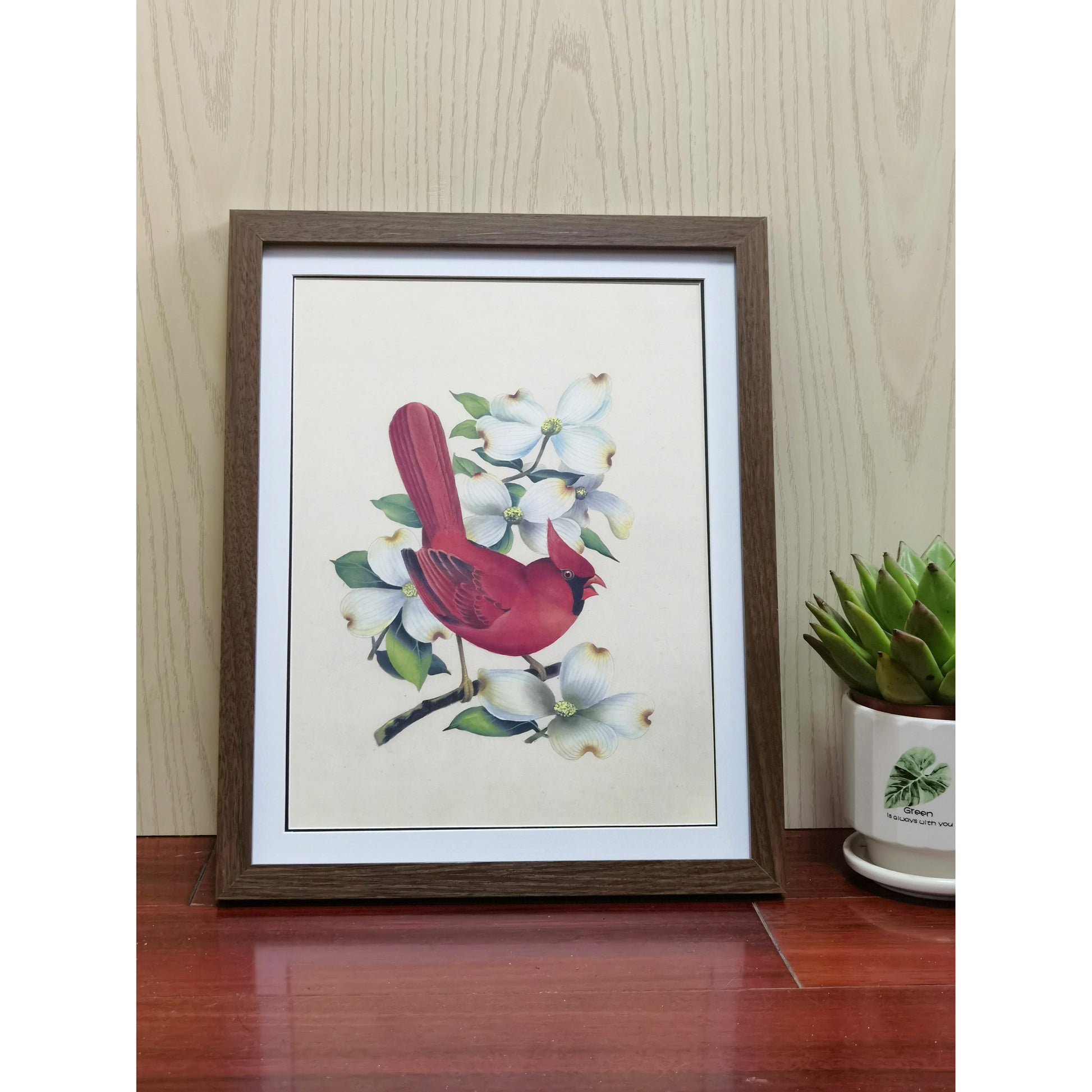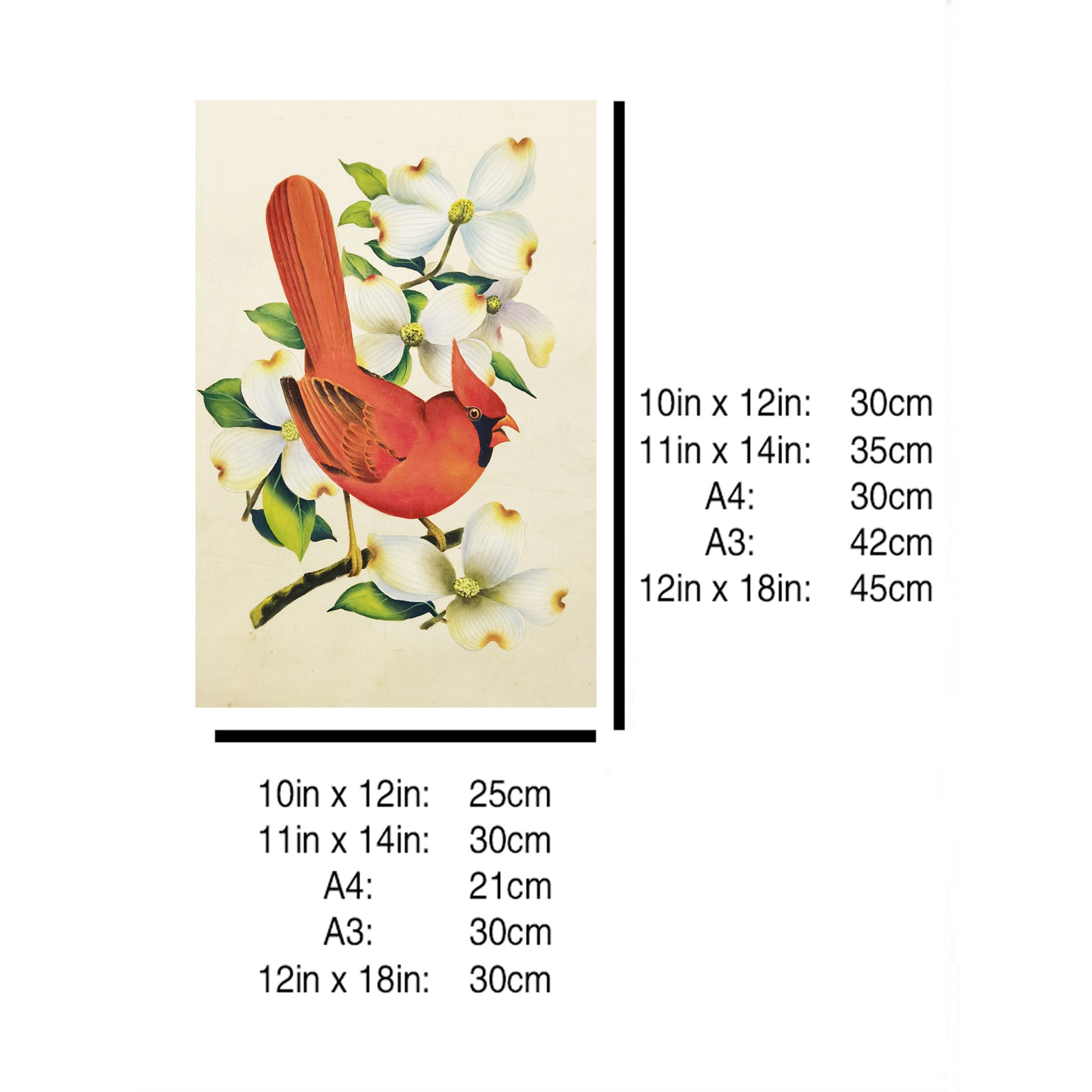 This stunning piece features the vibrant Northern Cardinal, beautifully hand-painted and printed on high-quality MATT paper. The rich, colorful print captures the essence of this iconic bird, while the natural wood frame adds rustic charm to any room. Whether displayed on a wall or as a tabletop centerpiece, this versatile piece is perfect for modern homes, offices, or as a thoughtful gift. Choose from multiple sizes and frame colors to perfectly match your décor.